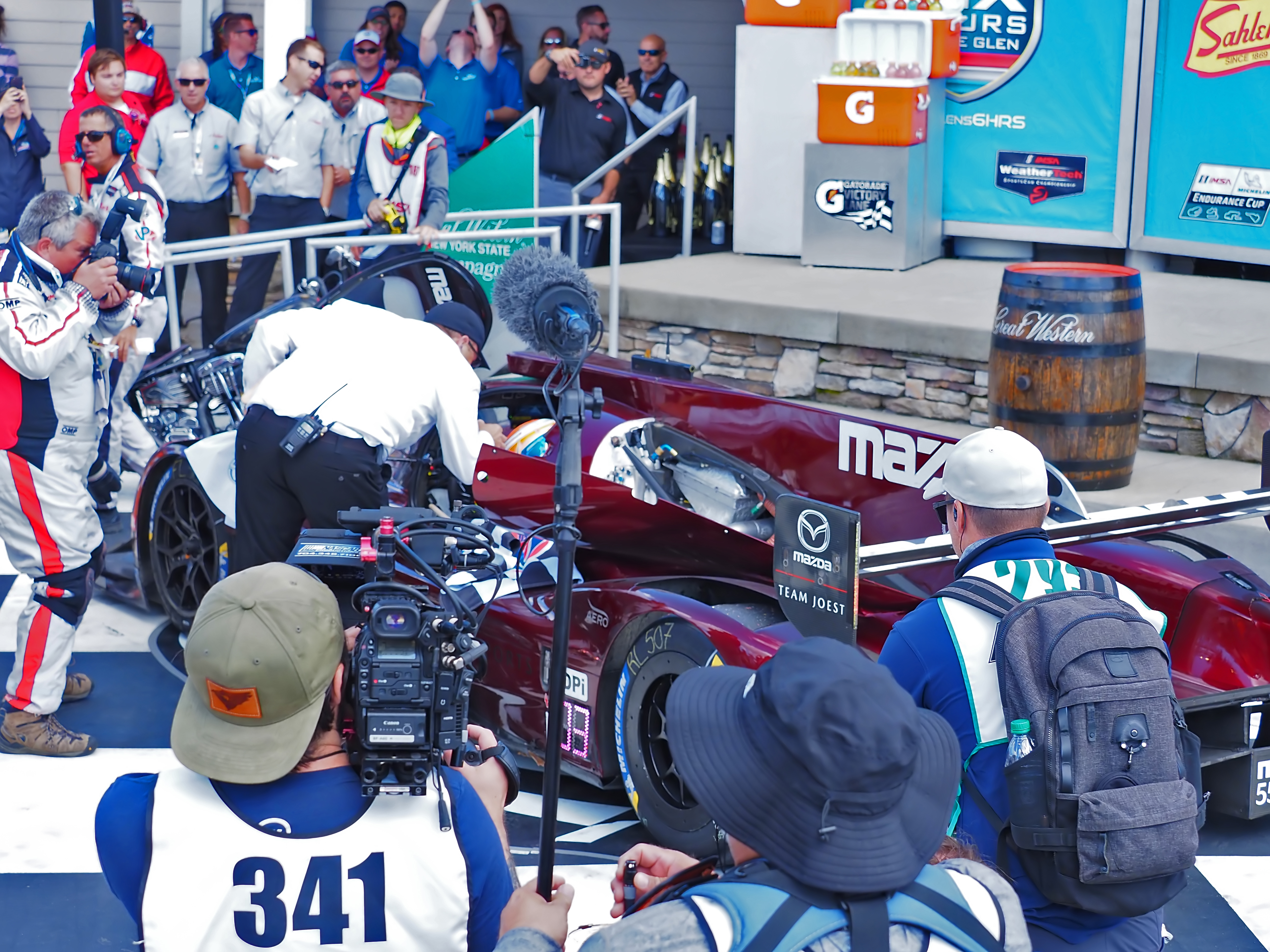 Mazda #55 at the victory podium. John Doonan is with Harry Tincknell. Mazda #55 is shown with the failing engine cover that refused to stay closed during the last 12 minutes of the race but it apparently was not severe enough to extract an aerodynamic penalty.