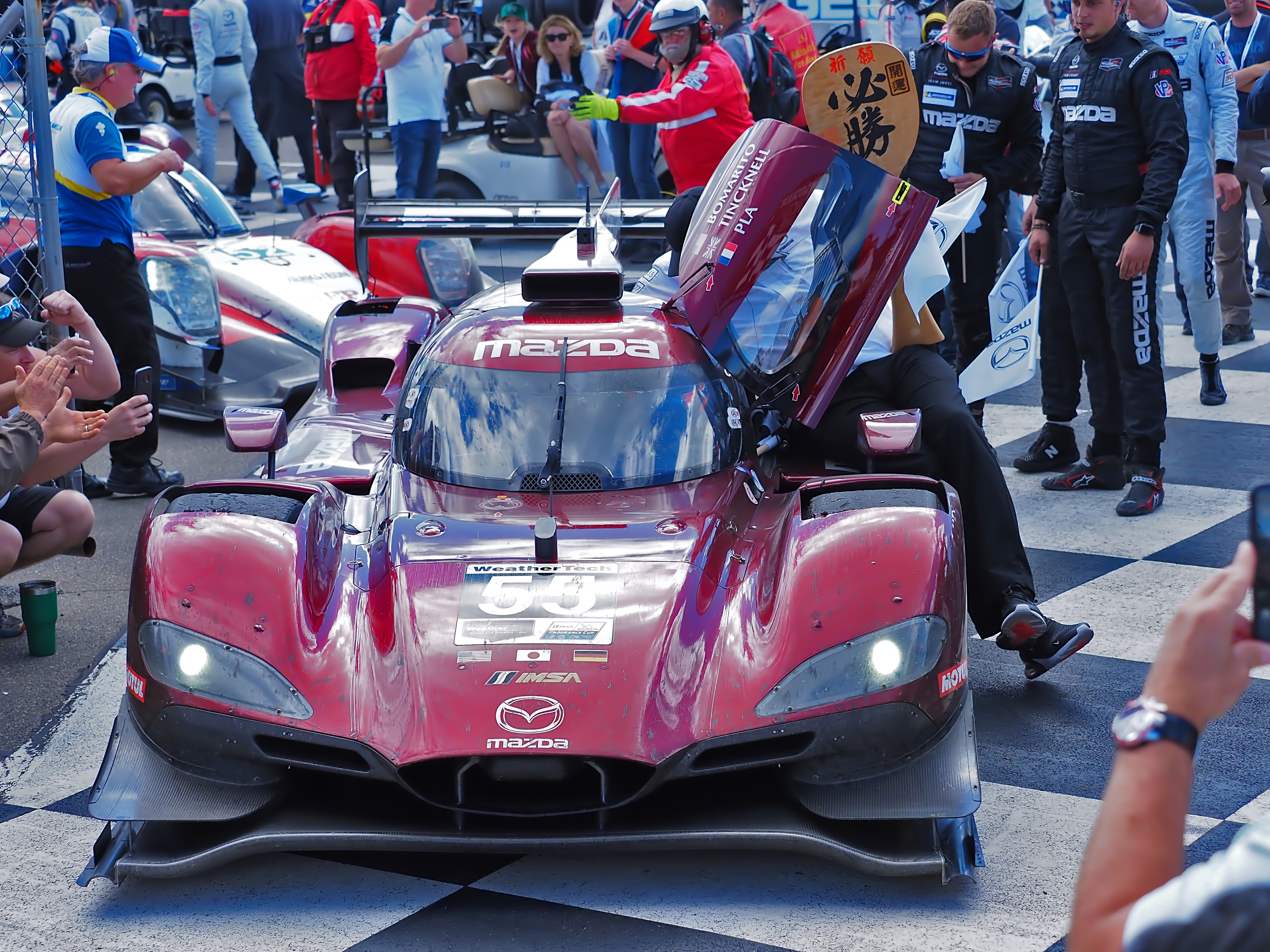 Mazda #55 enters the victory podium with an extra passenger. Mazda's North American Motorsport Director John Doonan hitches a ride with Harry Tincknell and the winning Mazda #55 as they enter the victory podium. The Japanese characters on John's paddle says hissho "to be sure of victory".