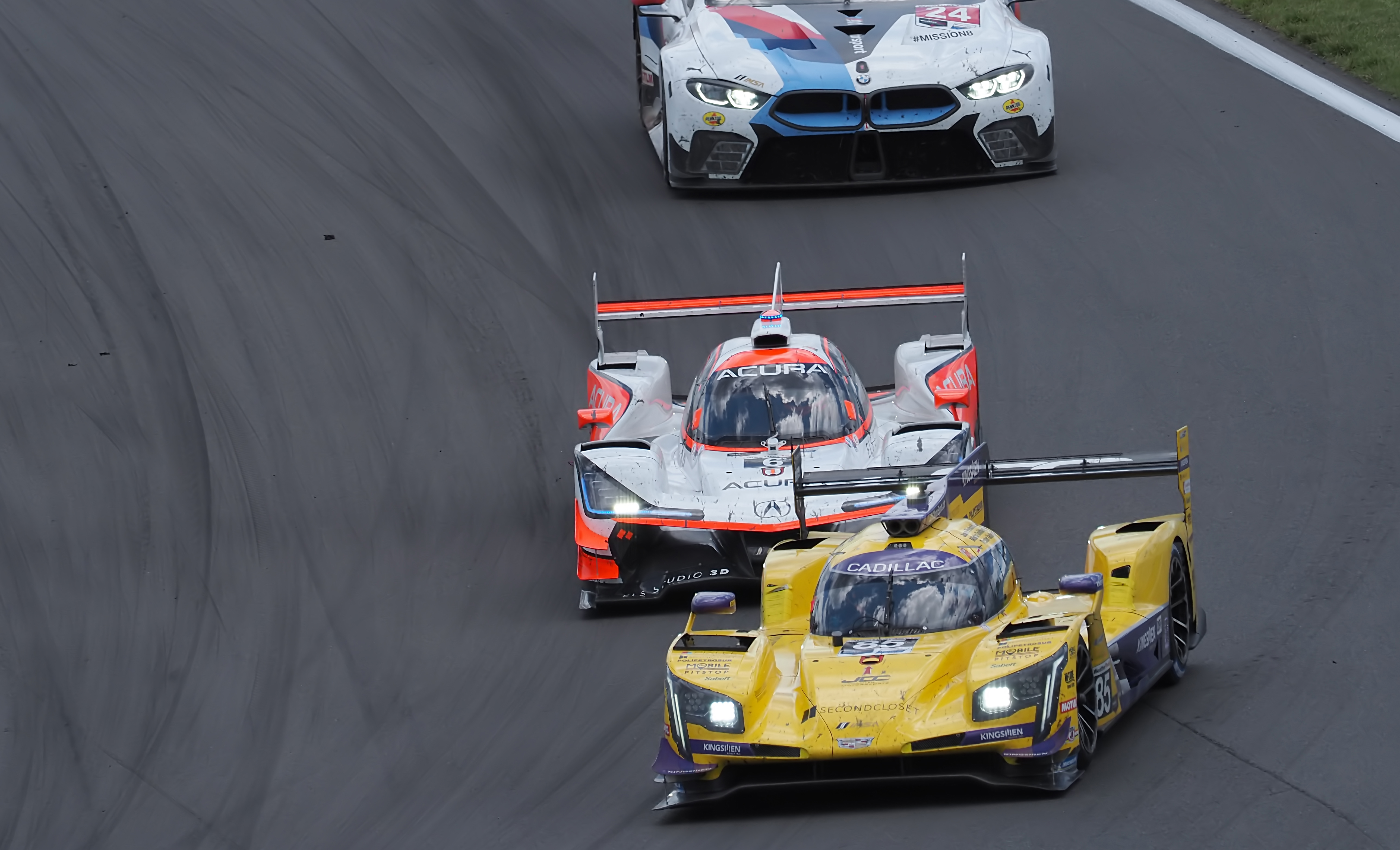 Penske Acura #6 is in third place at Turn #1. Despite starting the race from pit lane after the rest of the grid has cleared, #6 overcame the lap deficit by the 3rd hour and continues to threaten Mazda on Acura's quest to win a third consecutive race this season.