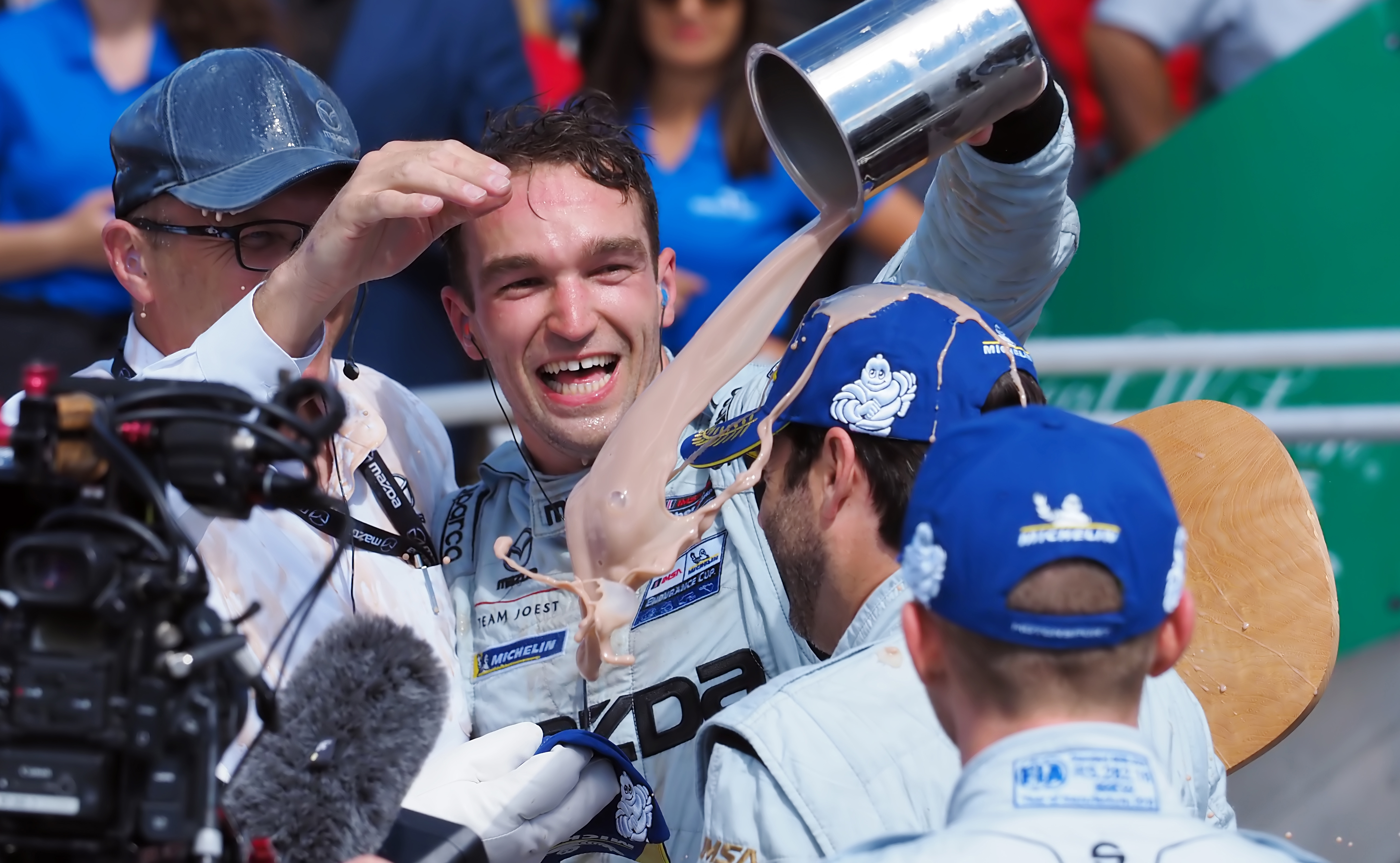 There really is enough to go around. Harry Tincknell hasn't forgotten his team mates Jonathan Bomartio and Olivier Pla and has found plenty of chocolate milk at the bottom of the mug. The Michelin Man confoundingly continues to try and clean off Harry's racing suit!