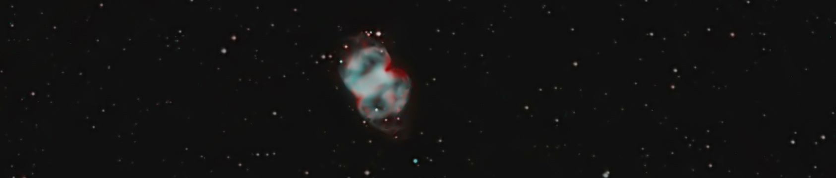 The image at the very top of the article is Messier 76 – The Little Dumbbell nebula is the gaseous shroud of a dying star photographed from my front door steps in 2010 using the false color narrowband approach described in the text.