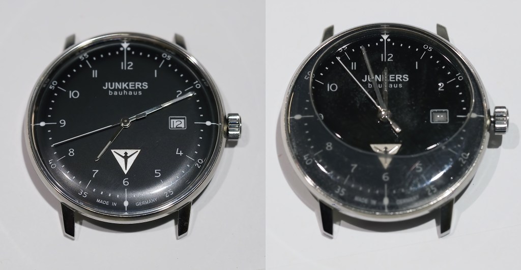 Some observations on the materials to be used. All liquids are chemically inert, electrically nonconductive and biologically nontoxic. They also have to be clear, colorless and odorless. Will the benzyl benzoate remain liquid in cold weather? Will it dissolve polystyrene? It is very inexpensive and has the low viscosity needed to easily penetrate all crevices of the movement and expel air bubbles. It has been reported that 100 cSt (centi Stokes) mineral oil used in one modification caused the watch to stop functioning after a few weeks due to suspected mechanical failure from component wear working in a viscous environment. You can buy Fluorinert in smaller 60 mL sizes but not the silicone oil from Sigma Aldrich with the low 5 cSt viscosity. The choice of watch to modify is also equally important in order to accentuate the visual advantages of using oil. I chose a pair of white and black faced Junkers Bauhaus watches using the Rhoda 515 Swiss quartz movement. True to its namesake, the dial faces are elegant simplicity with a vintage hesalite crystal in a domed profile not possible with glass or sapphire. Hugo Junkers (yun’kers) was a famed German industrialist whose aeronautical company in the early 20th century was the first to produce an all metal aircraft (1915) and an all metal civilian airliner (1919) and a fully pressurized passenger compartment for high altitude flying (1930). His company is also responsible for the standard cantilevered low wing design we see in almost every modern aircraft today. He was also a leading proponent of the Bauhaus movement of design. This is where form follows function and fine arts meets industrial design and production techniques to produce timeless iconic examples of modern minimalism with soul. Junkers was a socialist and a pacifist so when the Nazis came to power, they forced him to give up control of his aircraft company and patents and placed him under house arrest. He died very shortly thereafter. As a consequence Junkers is only popularly known for the bomber aircraft it made including the Ju-87 Stuka dive bomber. Today, his great grand-daughter upholds the family name with a new company that manufactures German made mechanical and quartz watches with aeronautical and Bauhaus themes. It is possible to buy modestly priced and well executed watches not made in China. For those of you who don’t share my personal trade embargo against China, do try and stay away from tomatoes, cotton, and some clothing made in China. Those have been proven to to be harvested and made with slave labor and officially embargoed by the US government.