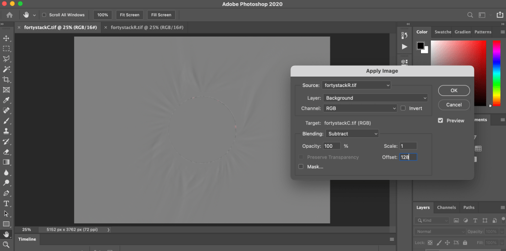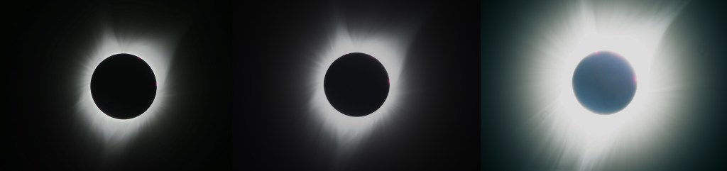 I used a phone app to change the shutter speeds and trigger the shutter release without touching the body and disturbing the tracking mount. I’m sure there are better apps availabIe today that can be preprogrammed to entirely automate this procedure and allow the individual to enjoy the eclipse experience. In 2017, I used the Olympus EM-1.2 at base ISO 200 and shot at 1/4, 1/100 and 1/400 of a second shutter speeds to capture the entire dynamic range of the corona. Multiple exposures were captured at each shutter speed and stacked to improve S:N response. You can use software called Nebulosity by Craig Stark which is now available in the public domain.