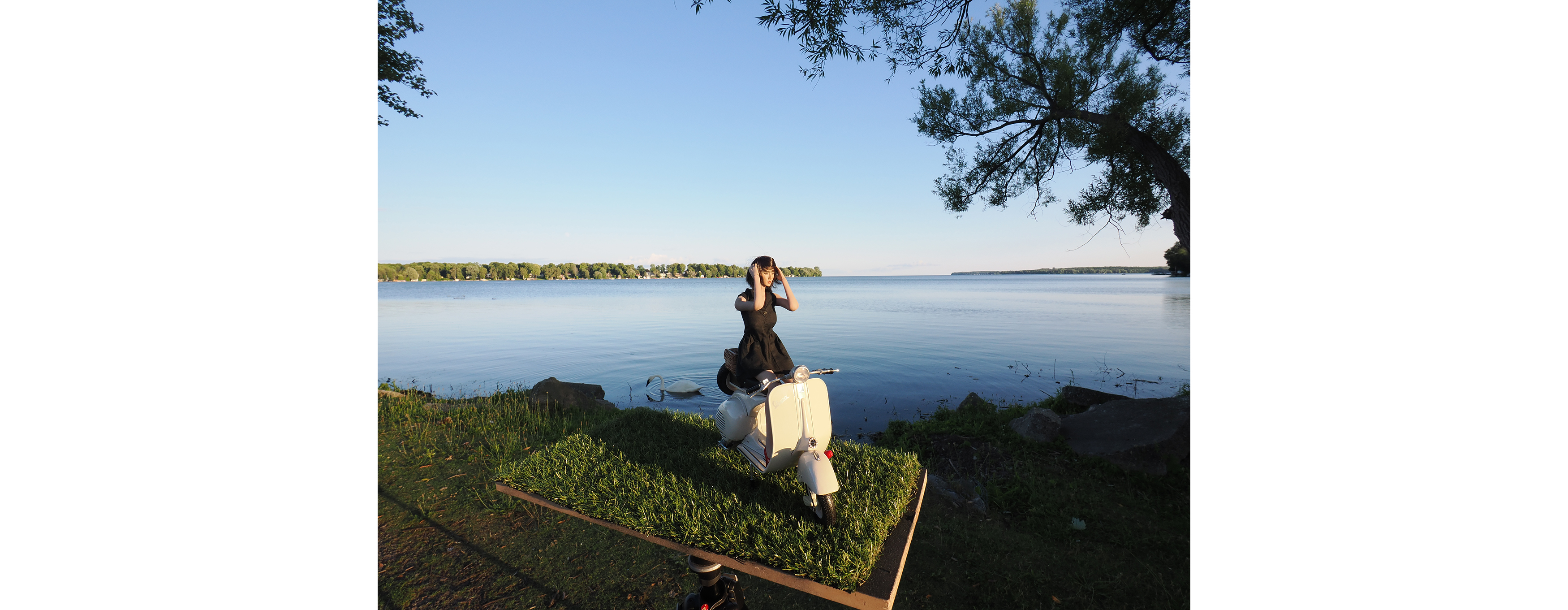 The model is highly poseable and with convincing hidden joints.  Although the Vespa model is highly detailed owing to its large scale, it required additional painting in silver chrome metallic to highlight the metal parts that are part of this iconic scooter, especially the radial divisions on the front horn and the many metal fasteners/nuts.  Shot on the northern shore of Lake Simcoe, Trumpeter Swans decided to visit and enhance the supernatural wonder of the location.  If you want to see the image at maximum size, zoom your browser view until the image occupies the entire width of the screen and the captions appear below it.