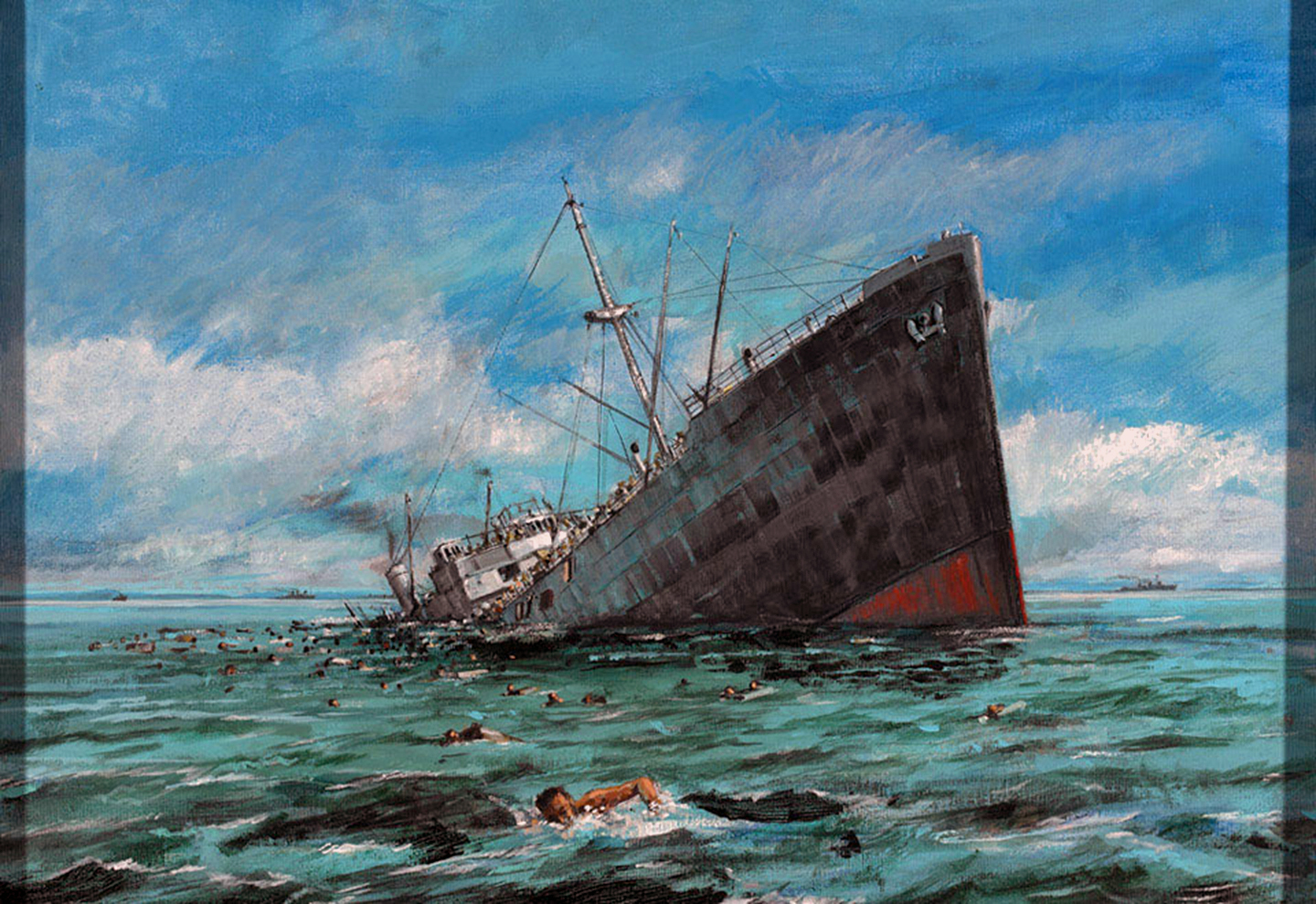 Fortunately, the Lisbon Maru would take more than a day to actually sink but meanwhile the Japanese had secured all hatches and covered them with tarpaulin leaving the POWs in the dark. Aside from a four man pump that they had tossed down the hold, the men now had no food, no fresh water and no access to the latrines. The dysentery forced the men to foul the rising water in the hold and the stagnant air grew hot and thick. More than 10 Japanese vessels had appeared on the scene and the soldiers were all evacuated off the Lisbon Maru leaving only the crew and a token force of 25 men to guard the POWs. They began to tow the stricken Lisbon Maru west while the POWs began communicating with each other in the different holds by tapping Morse code on the bulkheads. By 1 AM the next day, men began dying.